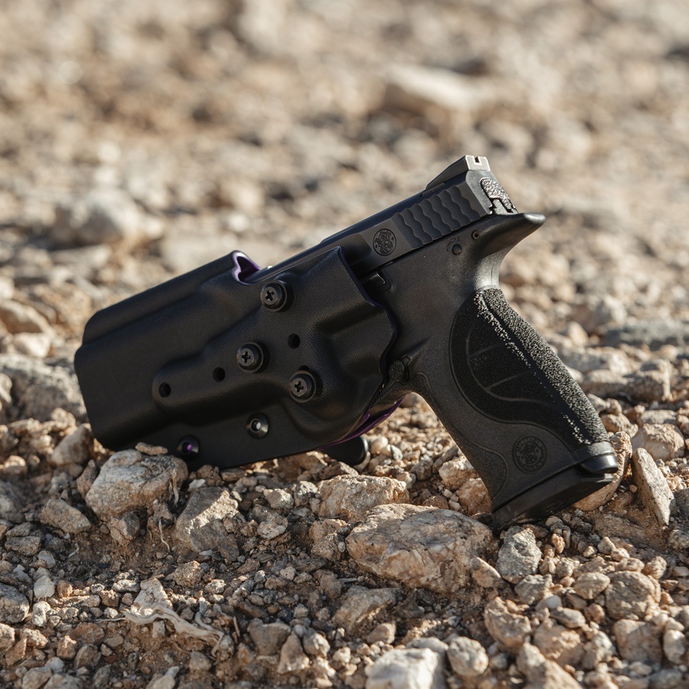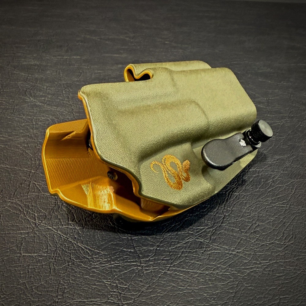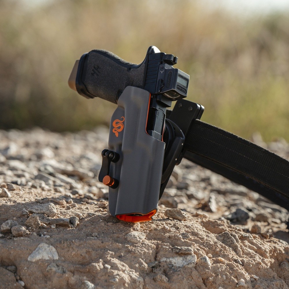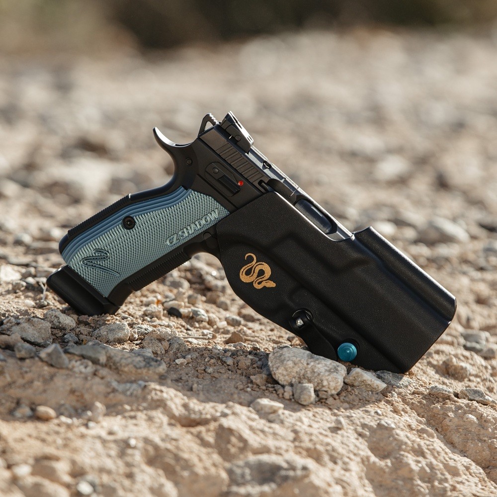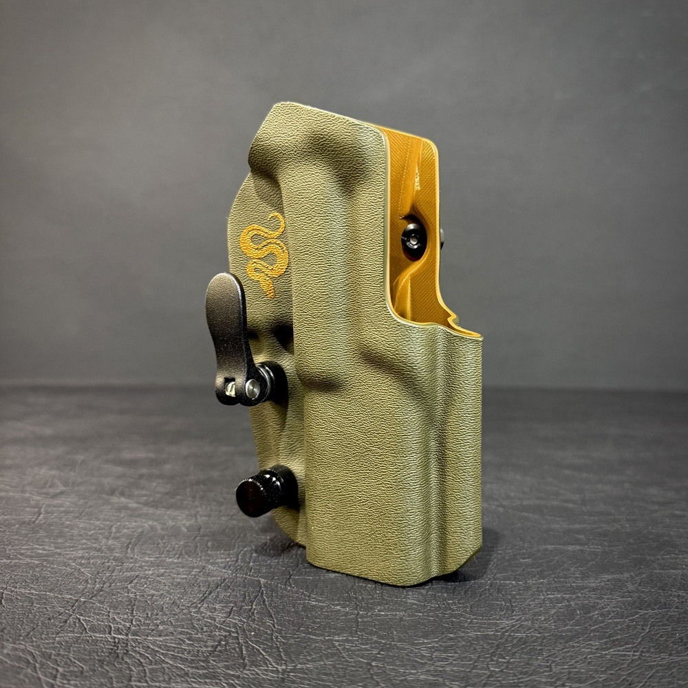 Stiff, slick, and strictly for competition use. These holsters feature dual layer construction for exceptional rigidity, a flared opening cut within 1/2″ of the ejection port, thumbscrew adjustable retention, and a universal Bladetech/Safariland mounting hole pattern for almost any belt attachment. The retention on these holsters is unique in our lineup – there is no positive click. This facilitates a slick friction-free draw with the ability to secure the pistol between stages with either the thumbscrews or the optional (recommended) throw lever.